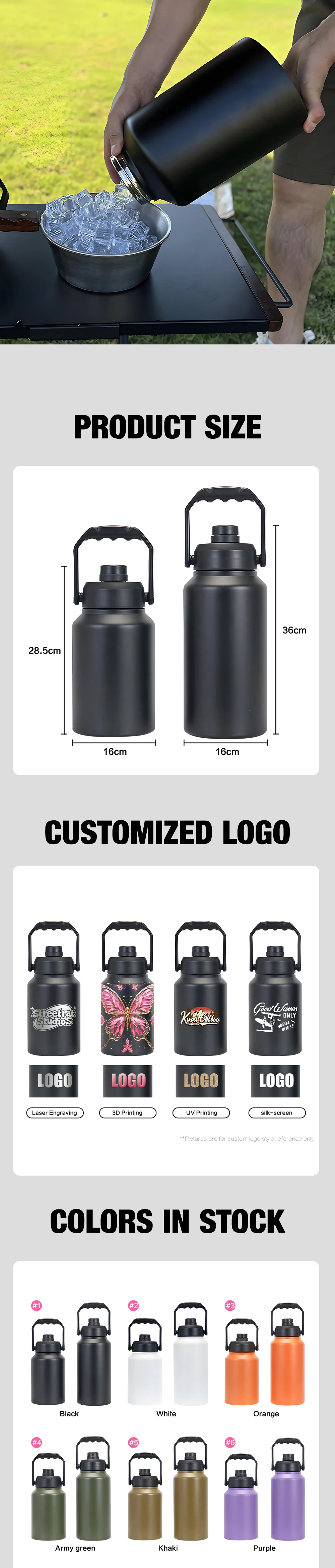 Extra Large 128oz Water Bottles for Camping Black 4L Handel Portable Vacuum Flasks for Ice Drinks Stainless Steel Outdoor Mugs